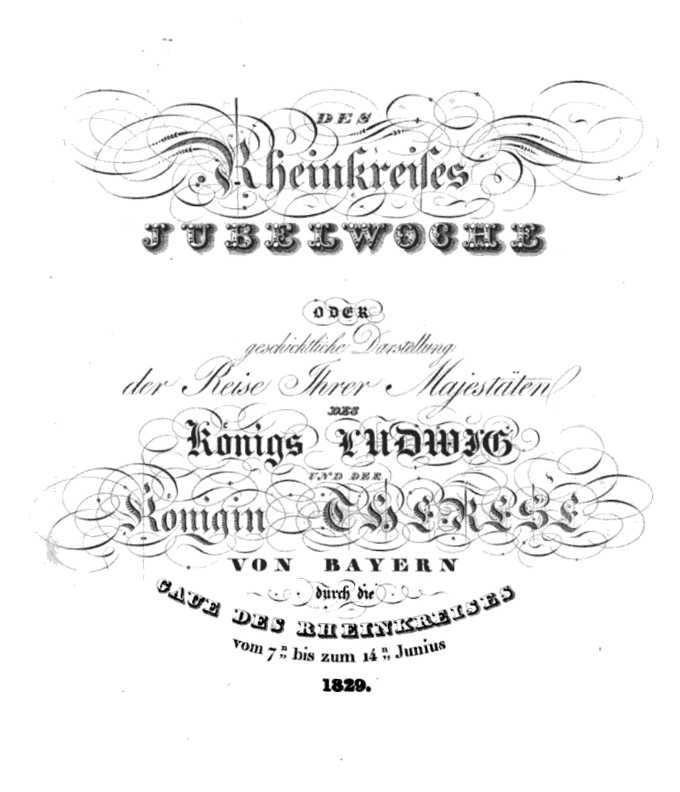 Diese geschichtliche Darstellung der Reise wurde von Georg Jäger geschrieben und unter dem Titel „Des Rheinkreises Jubelwoche“ vom Verlag Kolb 1829 gedruckt. Das Original wird in der Bayerischen Staatsbibliothek in München aufbewahrt. Auf den Seiten 31 und 32 kann man dies nachlesen.